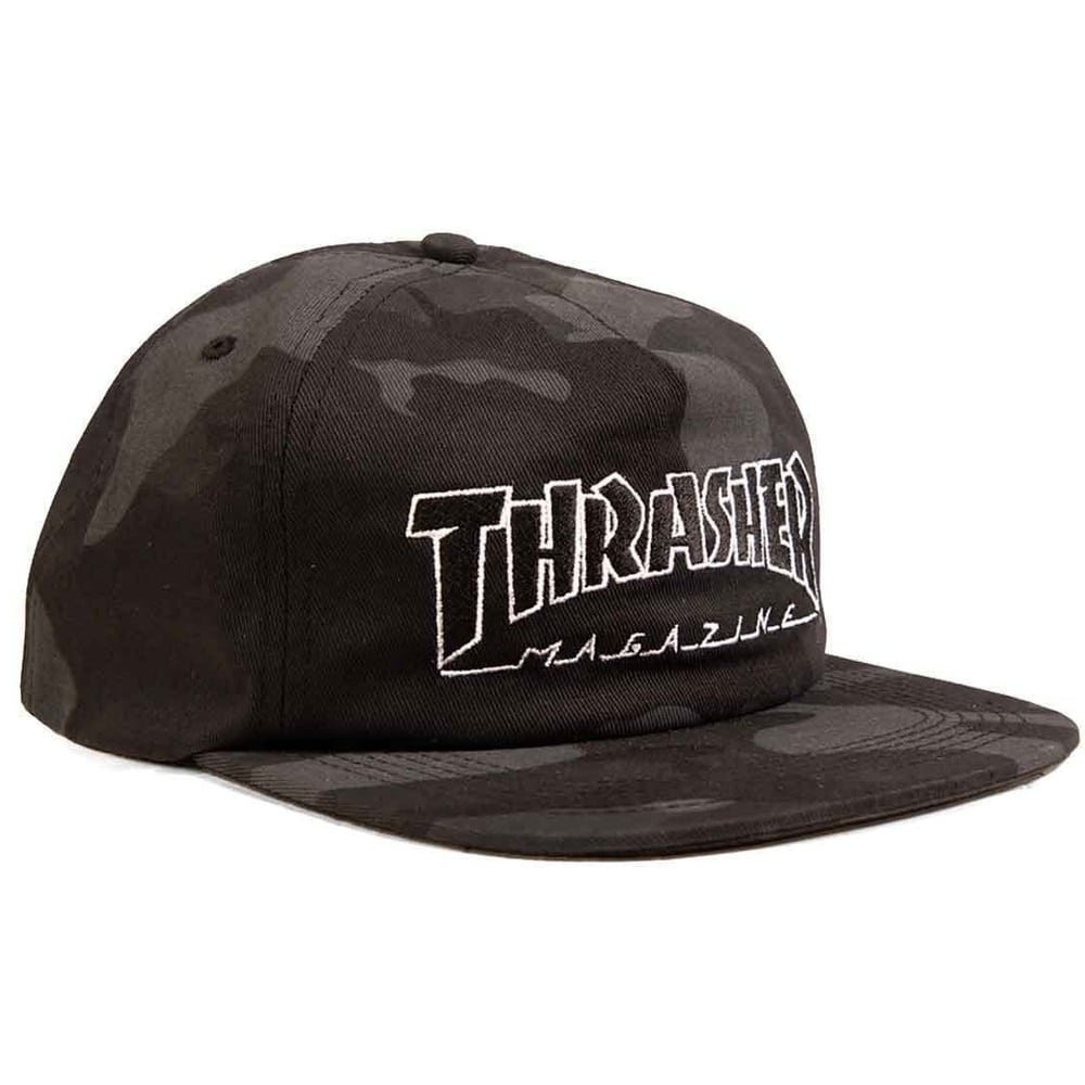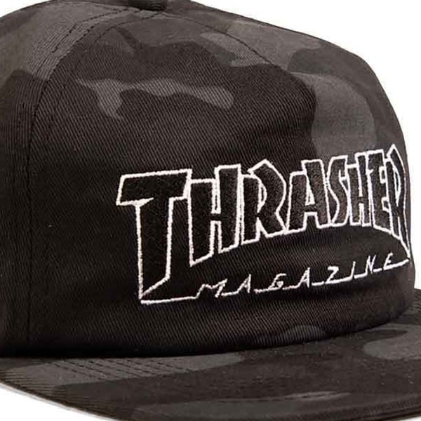 A 65% polyester 35% cotton black camo hat with an embroidered Thrasher Magazine front and an adjustable snapback.